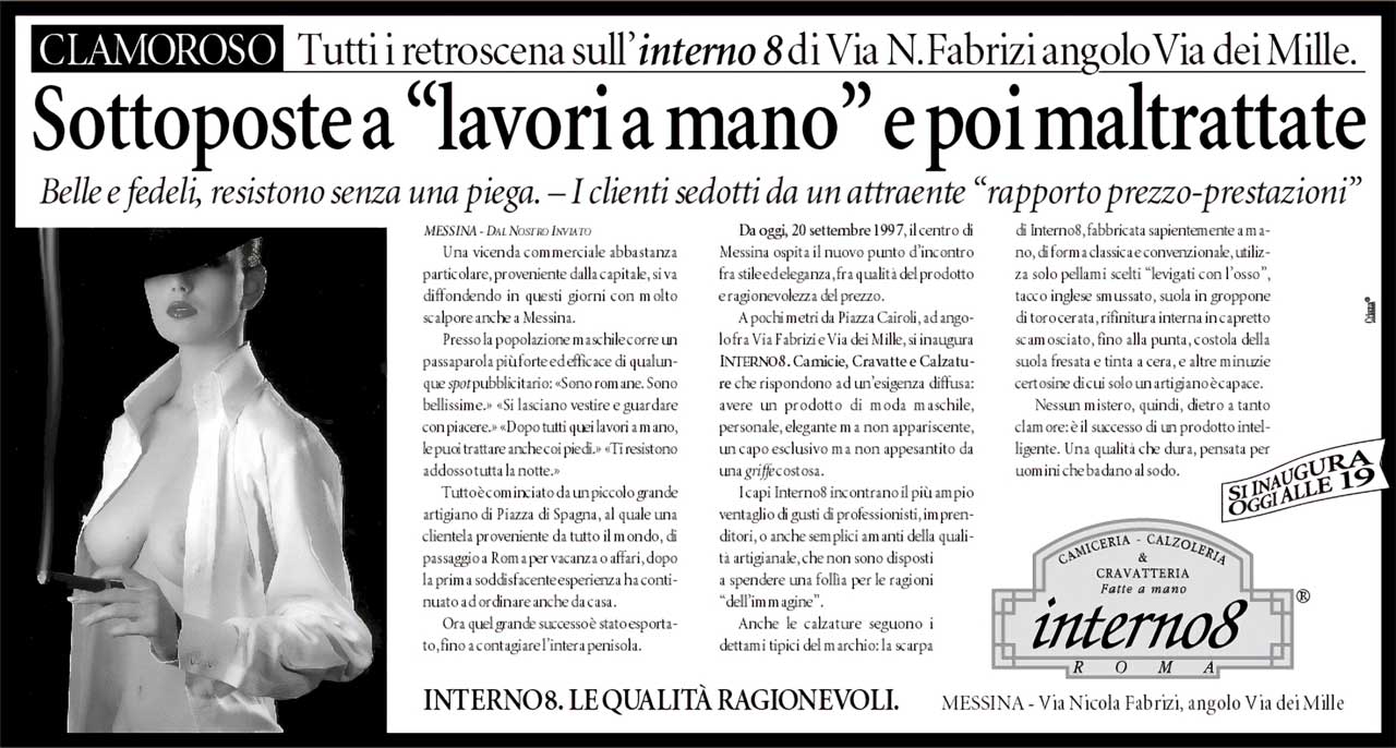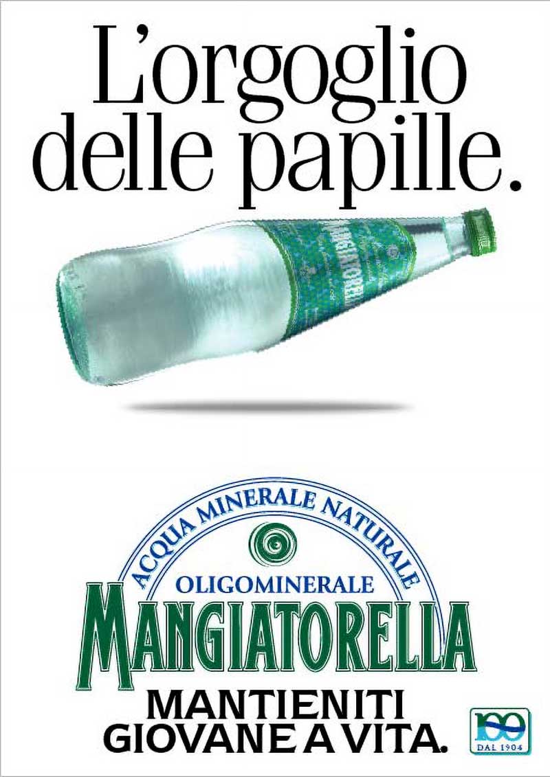 18 maggio 1998: in occasione dell’introduzione della pubblicità comparativa in Italia, Acqua Mangiatorella esordisce da subito con questa forma di comunicazione per “sfogare”, almeno una volta, la propria superiorità di prodotto nei confronti delle marche concorrenti, dotate di una share of voice molto più estesa (grazie a budget plurimiliardari — in Lire — e a un mercato più vasto). L’interpretazione controversa della nuova normativa, però, con la clausola del divieto di “sfruttamento del nome altrui”, induce cliente e agenzia a usare l’escamotage dell’iniziale al posto del nome intero per ognuno dei concorrenti citati (“L” sta per Levissima, “S.B.” per San Benedetto, etc.): la notorietà delle altre marche presso il largo consumo consente comunque di raggiungere gli obiettivi di comunicazione. E la campagna viene consegnata agli annali statistici come “prima in Italia”.